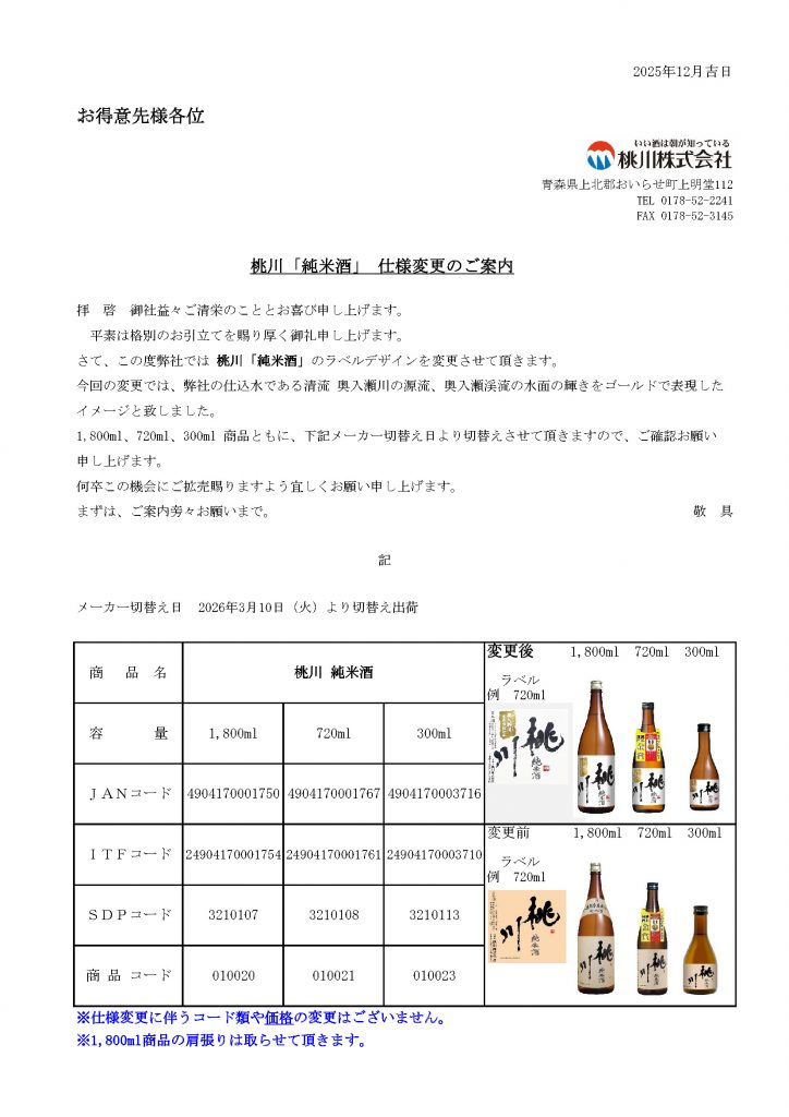 桃川「純米酒」 仕様変更のご案内